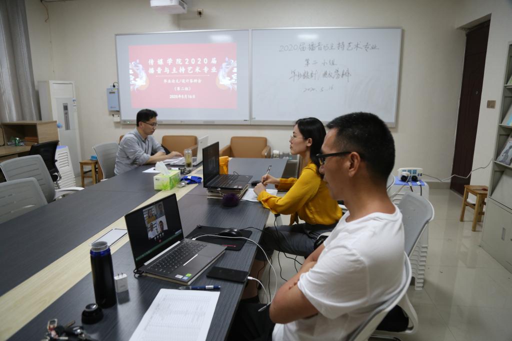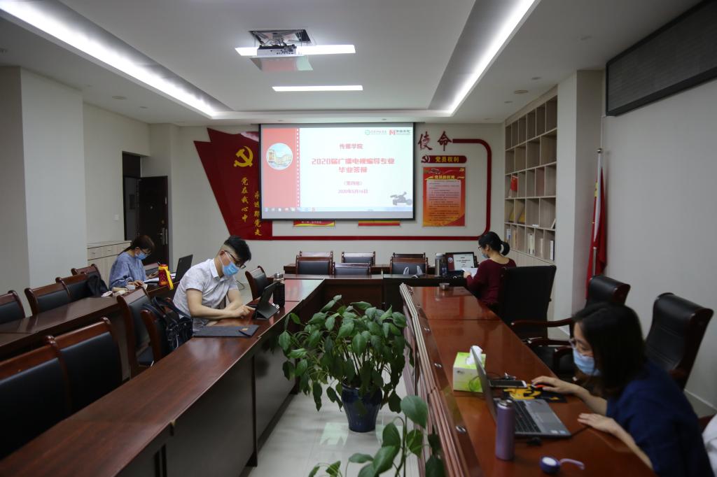 结合学校疫情防控需要和毕业生工作要求,437bwin必赢国际官网2020届本科毕业论文(设计)采取网络答辩。为有序开展网络答辩工作,学院成立以焦素娥院长、王振海书记为组长,以刘想如副院长、胡波副书记、刘新建副院长为成员的2020届毕业论文(设计)答辩工作领导小组。首场网络答辩于5月12日上午10点在社科楼104举行,焦素娥、王振海带领答辩工作领导小组莅临现场,对答辩工作给予指导。首场网络答辩由吕楠博士担任组长,对43名播音与主持艺术专业学生进行毕业答辩,答辩通过微信群进行。网络答辩分别于12日、15日和16日举行,16日下午3点在社科楼104举行最后一场网络答辩,答辩由张世海教授担任组长,通过腾讯会议进行。