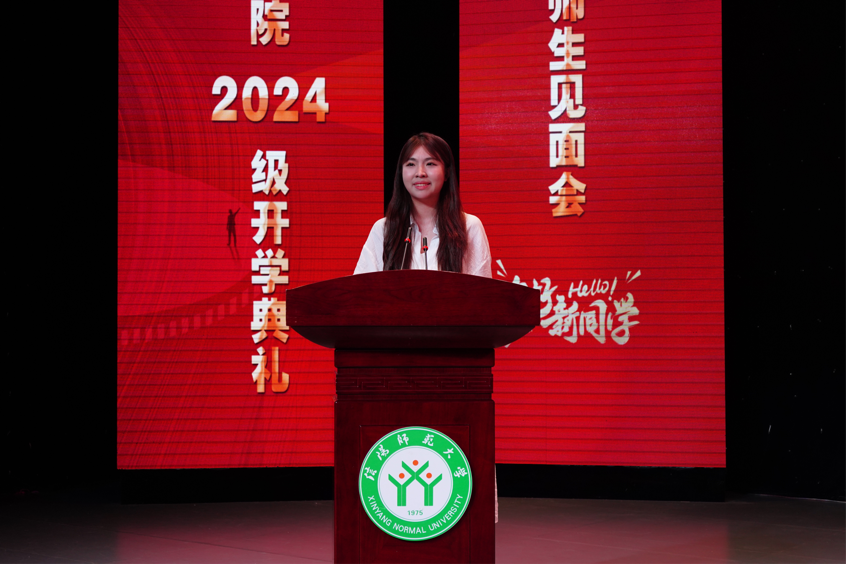 2024级播音与主持艺术班刘子研作为新生代表发言,她表示作为传媒人,将会以情感的温度温暖人心,以思考的深度启迪智慧,以知识的广度拓宽视野,共同为新时代的传媒事业贡献力量。