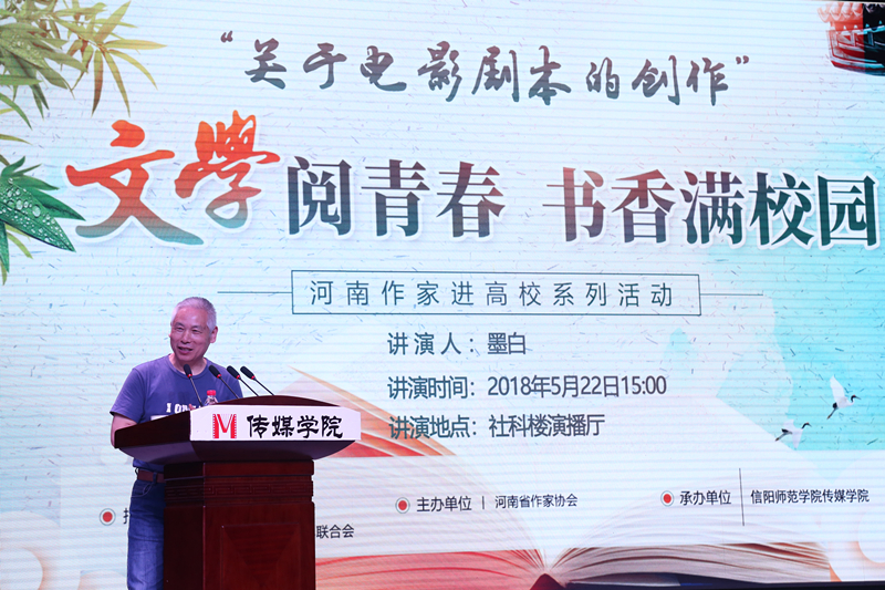 5月22日下午,由河南省作家协会主办,437bwin必赢国际官网承办的“文学阅青春,书香满校园”--河南作家进高校系列活动在我校社科楼演播厅举行,著名作家、河南省作家协会副主席墨白应邀作了题为“关于电影剧本的创作”的报告。信阳市作家协会副主席田军,437bwin必赢国际官网院长焦素娥、党委书记王振海、副院长刘新建,师生两百余名参加了报告会。报告会由焦素娥主持。