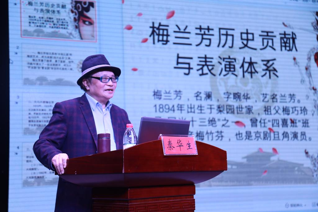 秦华生在报告开始前播放了1954年梅兰芳表演的剧目《贵妃醉酒》,向师生展示“梅派”的舞台魅力、京剧的艺术魅力。秦华生认为,梅兰芳的历史贡献和表演体系可以从三个方面进行研究。一是梅兰芳创立具有“中和之美”的梅派艺术,成为“四大名旦”之首。梅派的剧目丰富多彩,源于梅兰芳将新旧戏剧融会贯通,使梅派艺术形成一种独特风格的艺术流派,对戏剧艺术发展产生深远影响。二是文化大使梅兰芳,梅兰芳曾多次在国外进行访问演出,将中国戏曲的代表剧种京剧、昆曲展现在国际舞台上,影响深远。他还在演出之余,考察苏联、欧洲的戏剧,借鉴苏联、欧洲戏剧的优点,丰富自己的表演和中国戏曲。三是梅兰芳表演体系,秦华生论证梅兰芳表演体系的形成与他的四次访问演出息息相关。他以国际著名学者对梅兰芳的高度评价,证明国际社会对梅兰芳表演体系的认可。1982年孙惠柱在《戏剧艺术》上正式提出将“梅兰芳戏剧体系”与“斯式、布式表演体系”并列,并称之为“世界三大表演体系”。对此引发持续十几年的学术讨论,而秦华生始终坚持“三大体系”成立的主张。最后,秦华生与师生对我国戏曲艺术和现代影视艺术发展进行了深刻的交流讨论,令在场师生受益匪浅。