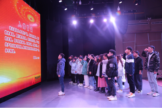 大会在庄严肃穆的《国际歌》中拉开帷幕。范少华宣读了29位参加宣誓的预备党员名单。在组织员尚弦同志的带领下,大家高举右拳,面对党旗庄严宣誓,表达了他们对党的忠诚和热爱。新党员代表赵锦华同志、老党员代表张婧同志、入党积极分子代表肖凡迪同学分别作表态发言。