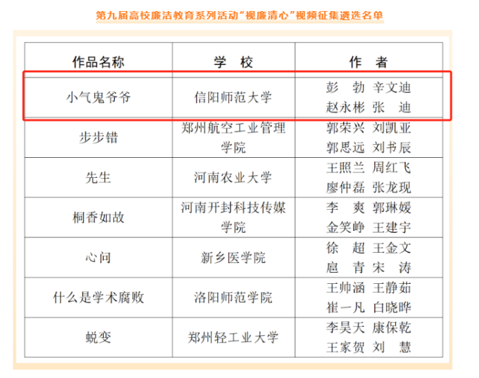 近日,教育部思想政治工作司公示了第九届高校廉洁教育系列活动评选结果,河南高校共有20部作品和4名高校师生入选,必赢国际官网报送的动画作品《小气鬼爷爷》入选“视廉清心”视频征集遴选名单。