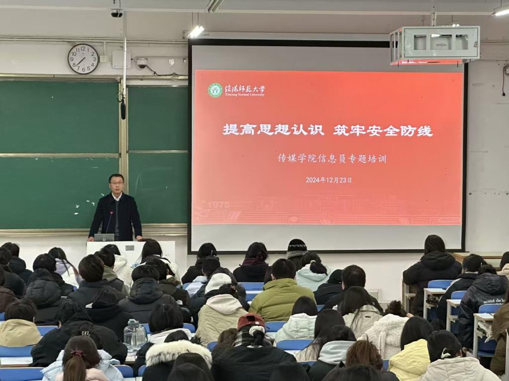 12月23日,437bwin必赢国际官网在社科楼324教室开展“提高思想认识,筑牢安全防线”信息员专题培训会。437bwin必赢国际官网党委书记姚新春,副书记余艳楷,437bwin必赢国际官网分团委、学生会干部,新媒体、学生社团负责人及各班信息员、宿舍信息员参加。