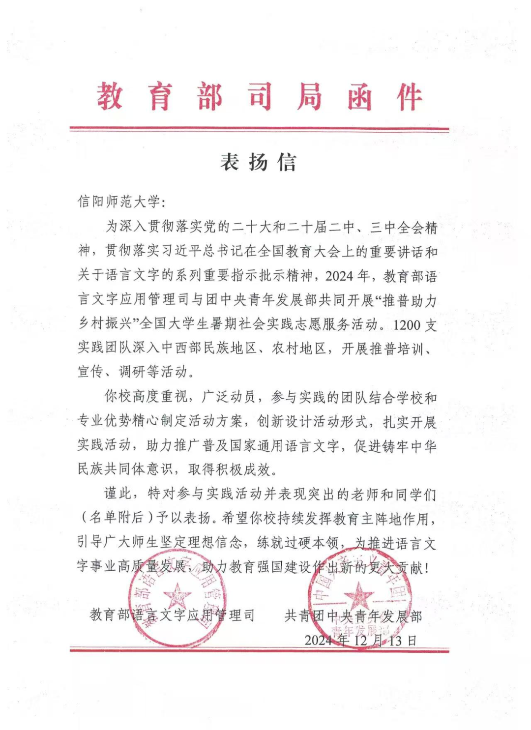日前,教育部语言文字应用管理司和共青团中央青年发展部向必赢国际437官方发来表扬信,表扬我校437bwin必赢国际官网李诗雨老师指导的2024年“推普助力乡村振兴”全国大学生暑期社会实践志愿服务团队的突出工作表现,肯定我校在推广普及国家通用语言文字方面做出积极贡献。