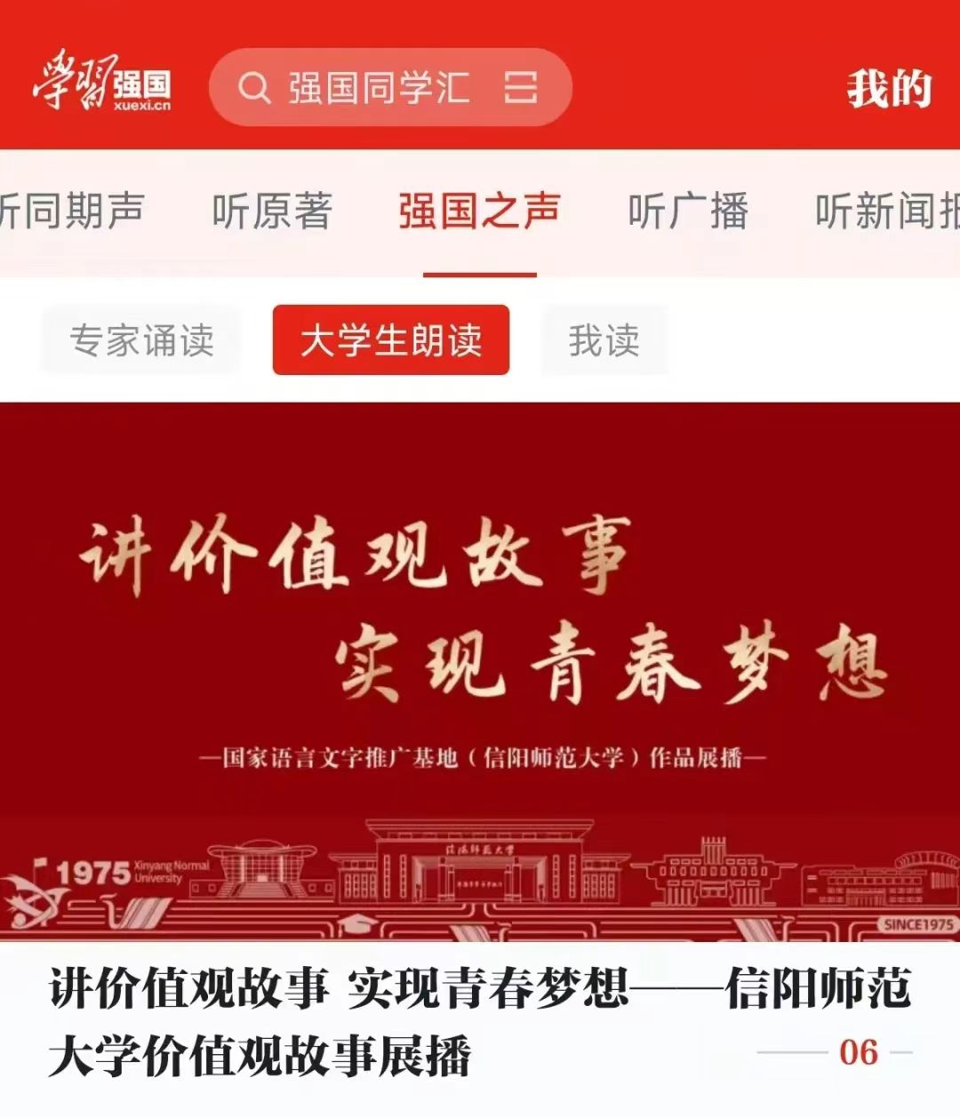 2024年,必赢国际437官方国家语言文字推广基地充分发挥学科专业优势,积极支持“学习强国”平台建设,精心策划并录制了《讲价值观故事 实现青春梦想——必赢国际437官方价值观故事展播》系列优质有声作品。作品上线后,深受广大用户喜爱,并荣登大学生朗读频道头版头条。截至目前,作品收听量已高达132万次。