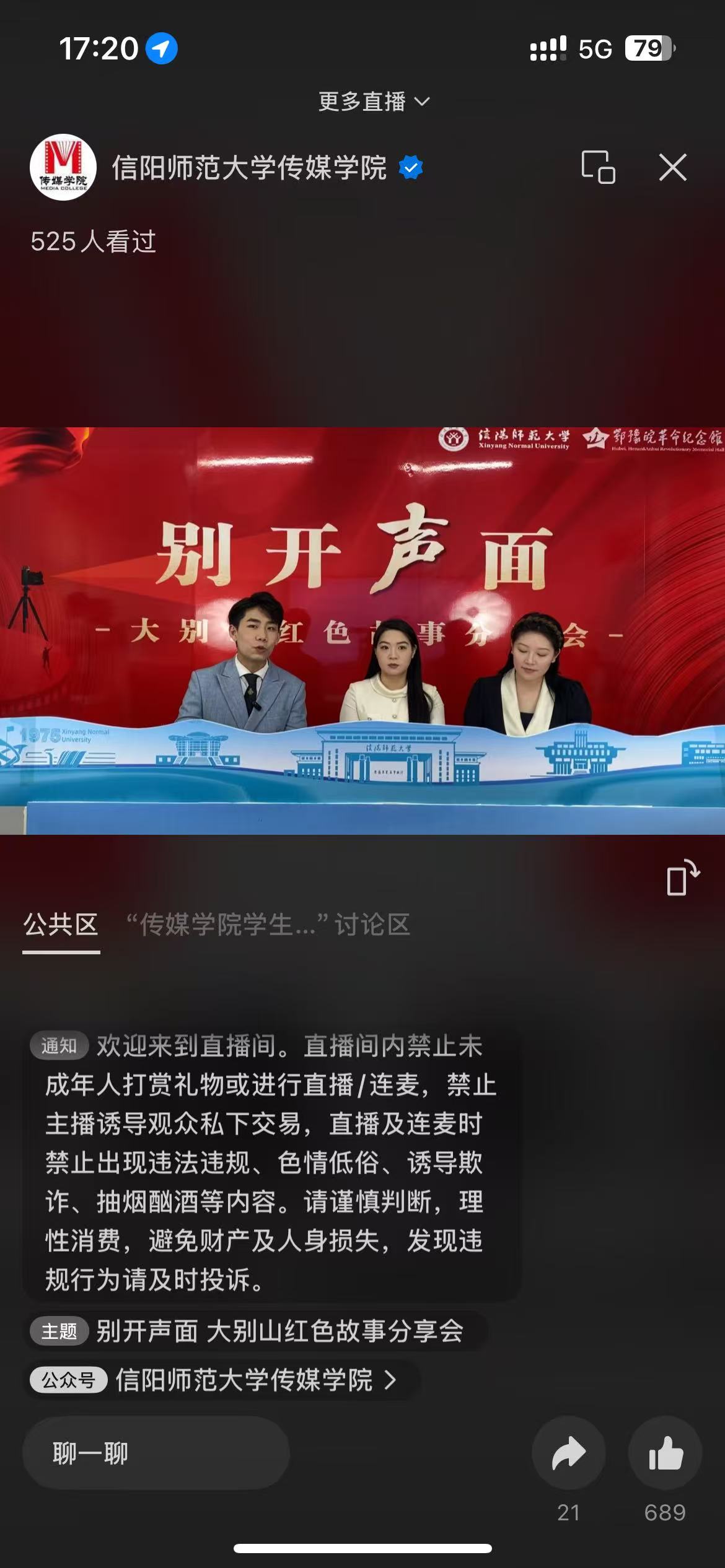 本次直播分享会以“传承红色基因讲述大别山故事”为主题,采用“学生主持+访谈嘉宾”的创新直播形式。直播中,讲解员们凭借丰富的专业知识,生动讲述了大别山地区在革命战争年代发生的英雄事迹,从红军战士浴血奋战的战斗历程,到当地群众踊跃支前的感人故事,一个个细节鲜活的历史片段让观众仿佛置身于那个激情燃烧的岁月。国家语言文字推广基地(必赢国际437官方)组织的437bwin必赢国际官网学生志愿者团队充分发挥专业优势,精心做好直播策划、技术支持和互动引导,将红色历史故事与现代传播方式紧密结合,不仅在直播中设置了“红色知识问答”“故事接力分享”等互动环节,还利用短视频剪辑、实时弹幕互动等形式,增强了直播的趣味性和参与感。