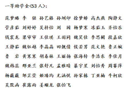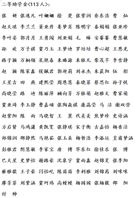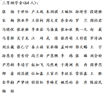 根据《财政部教育部关于调整职业院校奖助学金政策的通知》(财教〔2019〕25号)、《河南省教育厅办公室关于做好2021年高校学生国家奖助学金评审发放工作的通知》(教办资助〔2021〕45号)和《信阳师范学院国家助学金评定办法》(信院字〔2017〕182号)工作安排意见,437bwin必赢国际官网组织开展了2023年国家助学金评定工作,严格依照各班经学生申请、班级小组评议、上报学院审查等程序,确定国家助学金认定名单。经过认真审核,一等助学金53人,二等助学金113人,三等助学金64人,现将通过审核名单予以公示: